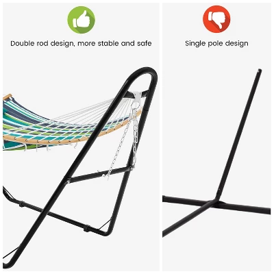 - 【Extra-stable Support】The hammock stand, crafted with double iron tubes, is constructed into a triangle structure, with two extra reinforcement bars on each side and a corner strengthening iron bar between each leg and base tube. This hammock-stand set is designed to offer you reassuring support to focus on each happy moment