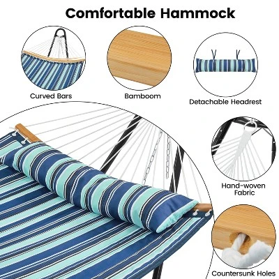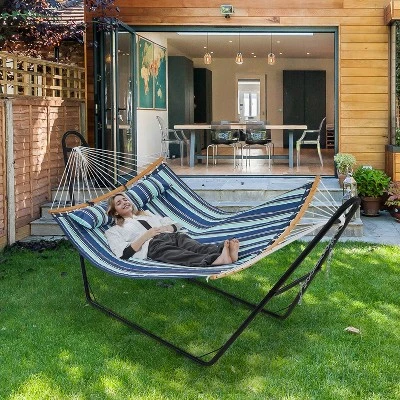 - This set includes a generous padded hammock and a durable metal frame, perfect for relaxing with friends or family in any outdoor setting, whether a courtyard, beach, or lawn. Crafted from 100% skin-friendly 170g polyester, this hammock offers durability, breathability, and a soft texture for a truly indulgent experience. The adjustable hanging options and two-way hanging capabilities of the hammock and stand allow you to customize your relaxation space to suit your preferences. Safety is paramount with the extra-stable support system and anti-tipping design, providing peace of mind while you unwind. The universal hammock stand and anti-slip foot pads ensure a secure and enjoyable outdoor retreat for you and your loved ones. Embrace the outdoors in style with this 2-3 People Hammock-Frame Set.