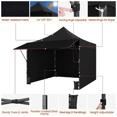 - Whether it’s jazzing up your backyard parties or providing essential shade for your garage sales, this 10ft × 10ft Commercial Pop-Up Canopy shields you from the elements. Crafted from PU-coated polyester fabric, this commercial canopy boasts excellent water resistance and durability. It’s a versatile solution for everyday use or various business occasions, including street pop-up shops and exhibitions. The adjustable height and awning angle of this pop-up canopy ensure flexibility to meet diverse needs. The 3-sided wall design ensures improved protection and shielding against challenging elements. Additionally, this 10 × 10ft large canopy tent can be collapsed and easily transported in a compact roller bag. This set includes a roller bag, three sidewalls, four guy lines, four metal ground stakes, and four sandbags for added convenience, making it a comprehensive package for your outdoor activities.