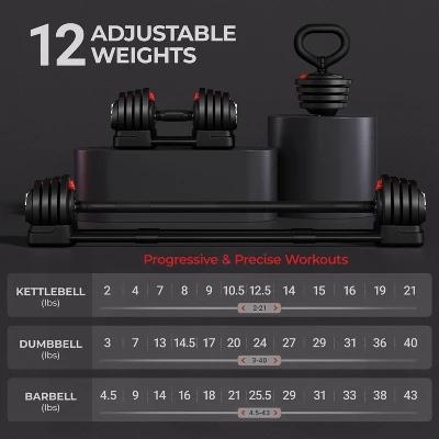 - 【3 Modes, 12 Weights, Endless Possibilities】Transform effortlessly between a dumbbell, a kettlebell, and a barbell with this versatile free weight set. Each mode offers 12 weight options, ranging from 3 lb to 40 lb for the dumbbell, 4.5 lb to 43 lb for the barbell, and 2 lb to 21 lb for the kettlebell, providing a wide range of possibilities for your free weight exercises.