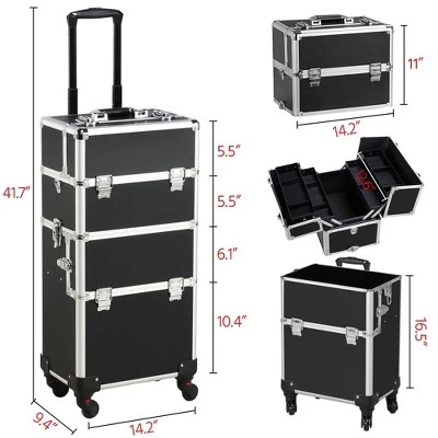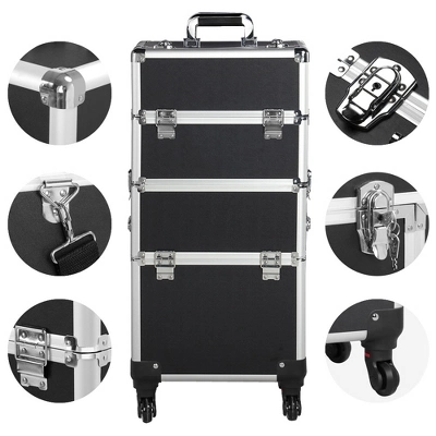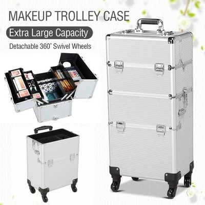 - This heavy-duty 3-in-1 cosmetic case trolley is constructed of premium aluminum in a solid structure with a max load capacity of up to 66 lb. It contains 2 compartments and 1 middle tray for organizing different sizes and shapes toiletry and accessories neat and in order. The detachable design allows its upper case to be used separately to meet your needs. This rolling lockable makeup case trolley features 4 casters for smooth, quiet and omni-directional mobility and sturdy lockable latches for added insurance.