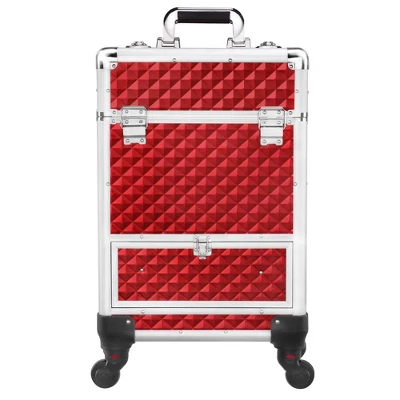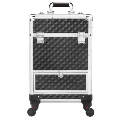 - This multitier cosmetics case is designed to keep your cosmetics and makeup tools in various kinds neat and handy. It has 4 slide-out side drawers equipped with antirust yet durable aluminum sliding tracks for extremely smooth operation. The large upper storage compartment can keep hair tools like a hair dryer, curling/flat iron, and other cosmetics that are in relatively large sizes. The bottom drawer can hold hair brushes and short bottles. Detachable all-directional rolling wheels are convenient to carry around. The vibrant holographic color palette and embossed diamond texture make it an eye-catching piece among all the cosmetic cases. Aesthetically pleasing professional makeup train case with powerful functions.
