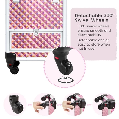 - Designed for Trip:This makeup case adopts 4 detachable high-quality wheels for quiet and effortless rolling. A Smoothly sliding pull-up handle with innovative hexagon tubes ensures excellent steadiness. Handle on the top for convenient carrying.
