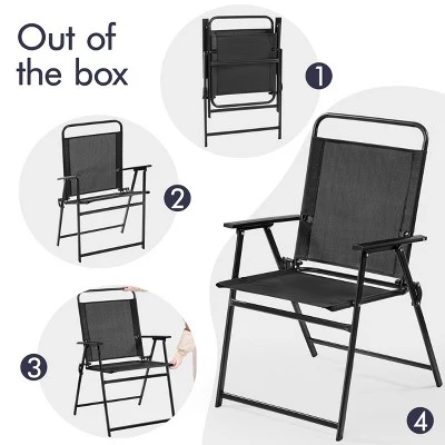 - Crafted with durable Texteline material, this Outdoor Foldable Dining Chair set is designed to withstand the elements while exuding classic elegance. Whether you’re hosting a party or enjoying a quiet garden dinner, these chairs offer a cozy, space-saving and weather-resistant seating solution. The classic and simple design of these Texteline garden dining chairs adds a touch of sophistication to any outdoor setting. Made from high-density 550g Texteline, these chairs provide optimal support and comfort while remaining lightweight and breathable. The foldable design allows for easy storage and movement, making them ideal for those with limited outdoor space. With ample seating space and ergonomic armrests, these chairs are designed for maximum comfort. The robust iron frame ensures stability. Arriving fully assembled, these lawn chairs are ready to use right out of the box, allowing you to effortlessly enjoy your outdoor gatherings.