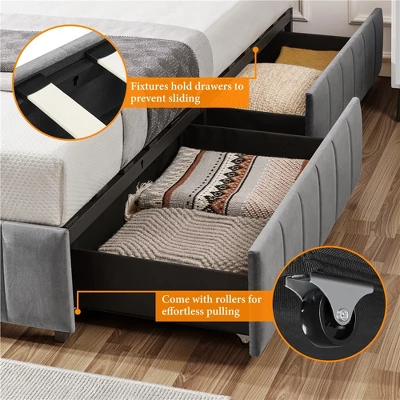 - This upholstered bed frame with Drawers would be right at home in a five-star hotel – and in your bedroom, of course. The no-fixed headboard design can customize your desirable headboard according to your style, and the frame is crafted from sturdy metal and wood slats. Available in your choice of neutral hues, this bed just might inspire you to redo the entire room around it. We love how the drawer-storage design provides a large amount of space as you organize or hide daily essentials before falling asleep. Best of all, this bed doesn’t require a box spring, so it’s ready to support your mattress right away.
