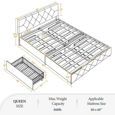 - 【Drawer Storage】Comes with 4 wire netting drawers with rollers under the bed, this upholstered bed frame provides convenient storage space for keeping your off-season clothing organized, creating a clean and tidy look.