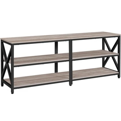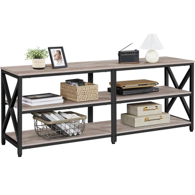 - This storage TV console table, which is crafted out of the high-qualified particleboard and supported by a strong iron frame with two X-shape strengthening structures, is durable and safe for long-time service.Featuring rustic color, simple structure and minimalist lines and edges, our TV stand is designed into a vintage style that can harmoniously integrate into almost any room decors and create a welcoming and soothing vibe to your space. Except for the excellent materials and nice style, we also attach great importance to its practicality. Under the tabletop arranged a 2-layer open shelf divided into 4 independent grids. You can store your CDs, books or anything you want on it.