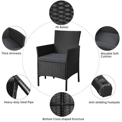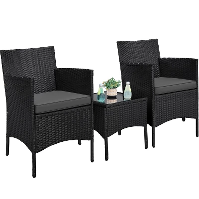 - Let this three-piece wicker furniture suit illuminate your veranda, terrace, or living area! The rattan chairs and table are constructed with a high-quality steel frame and waterproof PE rattan, ensuring durability against rain, sun, and wind while maintaining their condition even with prolonged use. The chairs are equipped with soft foam-padded seat cushions that resist deformation. Suitable for both indoor and outdoor use, all necessary hardware and instructions are provided for easy assembly. Bring home this practical chair and table set today!