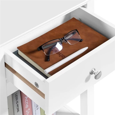 - 【1 Drawer & 1 Shelf】This slim nightstand features a drawer and a lower shelf, giving you room to store various stuff and create a tidy area. The drawer can store some small, private items, and the open shelf can display decorative objects or place books, magazines, etc.
