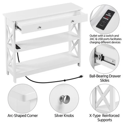 - This console table with a power outlet, a big drawer, and 2-layer shelves. You’ll know what I mean. Quality panels with water-resistant treatment are very easy to clean. Heavy-duty construction is built to last for years. The classic wooden design fits your home/commercial purposes well. Best of all, it is a budget model that aims to have all your concerns covered.