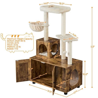 - 【2-in-1 Cat Furniture】This furniture combines a small cat tree with a pet litter box cabinet, providing your cats a perfect place to observe, play, relax, and meet all their entertainment and rest needs. The furniture measures 31.5″ L × 18″ W × 53″ H, making it a practical and functional choice for your cat.