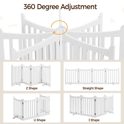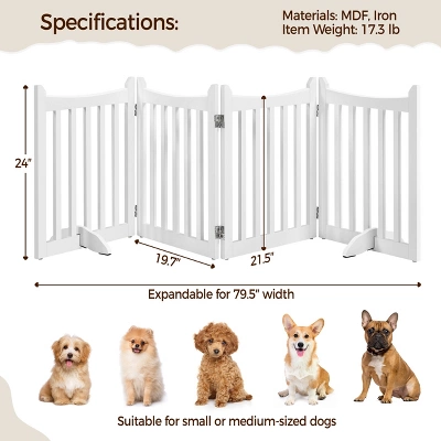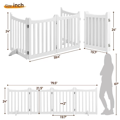 - Crafted from durable MDF, this 4-panel pet gate offers a stylish solution to keep your canine companion or furry friends contained while you’re away. Not only does it ensure their safety, but it also injects a touch of charm into your living space. With its customizable width, you can effectively block off any entryway with ease. The gate’s innovative design allows for versatile folding configurations, including the classic I/Z/U shape or a neat square. Complete with protective footpads and EVA foam for floor protection and stability, this gate is a must-have for doorways, entryways, halls, bedrooms, or even staircases.